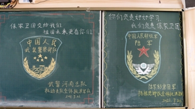 ??“保家衛(wèi)國交給我們,祖國未來更看你們!”“你們負責好好學習,我們負責保家衛(wèi)國!”在鄭州市第七十三中學的一間教室里,參與救災(zāi)援助的抗洪官兵們給同學們留下了兩幅黑板報。在師生們眼里,這就是名副其實的“最美黑板報”。