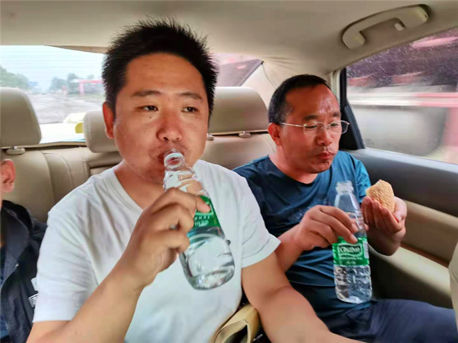 記者連續(xù)在扶溝賈魯河防汛一線采訪一整天時(shí)間,圖為周口日?qǐng)?bào)記者張勁松、張洪濤在采訪車中吃飯。