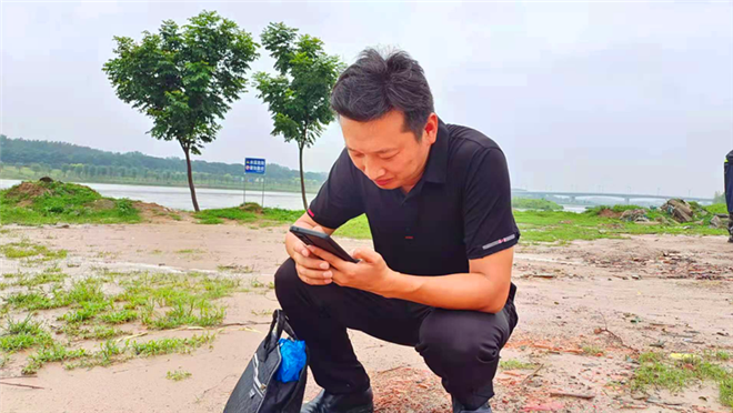 張志新在賈魯河西華城區(qū)段采訪汛情后現(xiàn)場(chǎng)寫稿