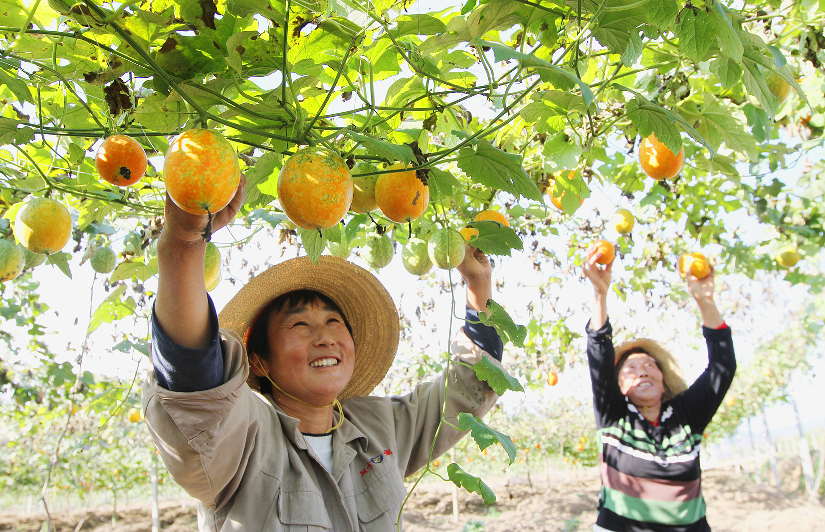 圖1:房縣軍店鎮中村村農民在中藥材產業園采收吊瓜。 圖片由十堰日報社提供