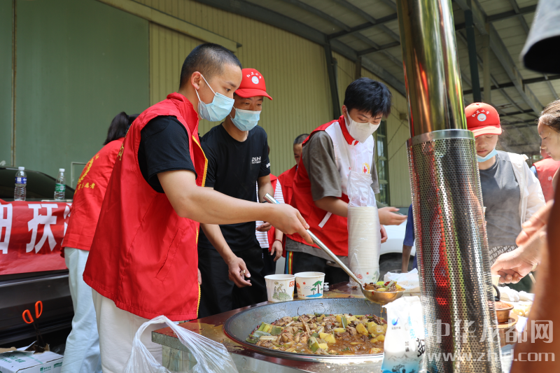 27日,他們又驅車近百公里來到這里,生火做飯。一位前來就餐的頭發(fā)花白的老大爺,拿出賣菜的喇叭激動地吆喝著:“商水的人好著呢!商水的小伙子來給咱做飯呢。真的謝謝你們,我唱首歌謝謝你們!”大爺?shù)母杪曪柡媲椋F(xiàn)場的群眾無不動容,也一起唱了起來,“沒有共產(chǎn)黨就沒有新中國,沒有共產(chǎn)黨就沒有新中國……”