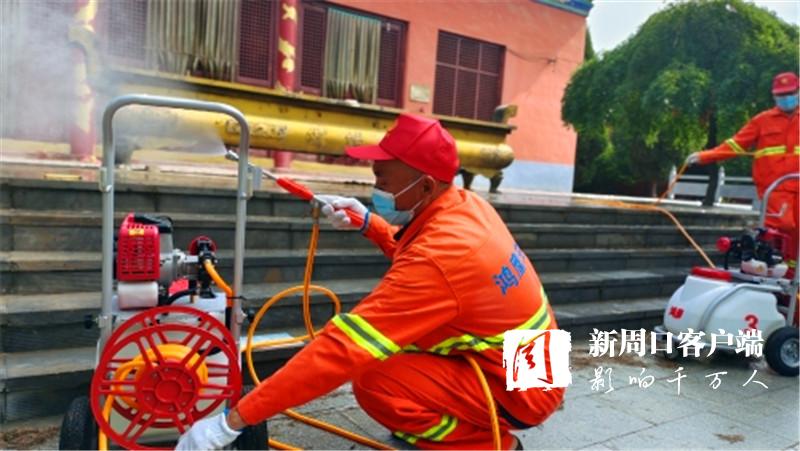 在女媧景區,只見老關和其他3名消殺人員發動機器、拉出噴管、手提噴槍,一邊前進,一邊揮動,白色水霧隨之噴涌而出,所到之處細菌病毒“無處遁形”。大家齊心協力,很快就把景區的角角落落消殺個遍。