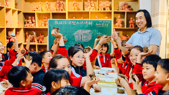 “這作品形象逼真,太生動了。”昨日,在張振福鈞瓷泥塑藝術(shù)館,同學們被一件件憨態(tài)可掬的泥塑作品驚呆了,看到活潑、歡快、形態(tài)各異的泥塑兒童造型,大家紛紛稱贊。