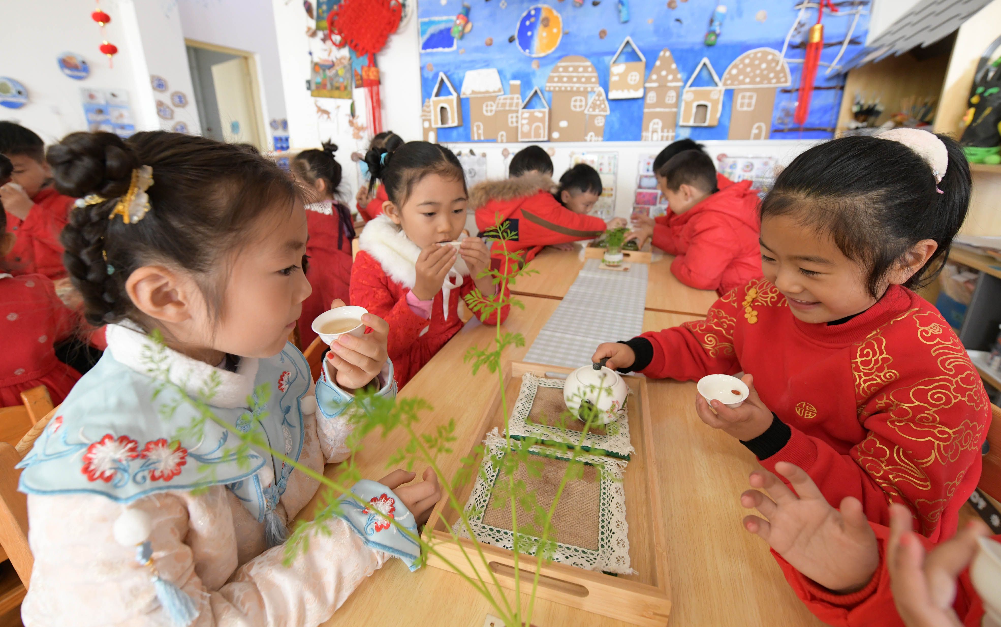 小朋友們學習傳統茶藝,喝冬至暖茶。