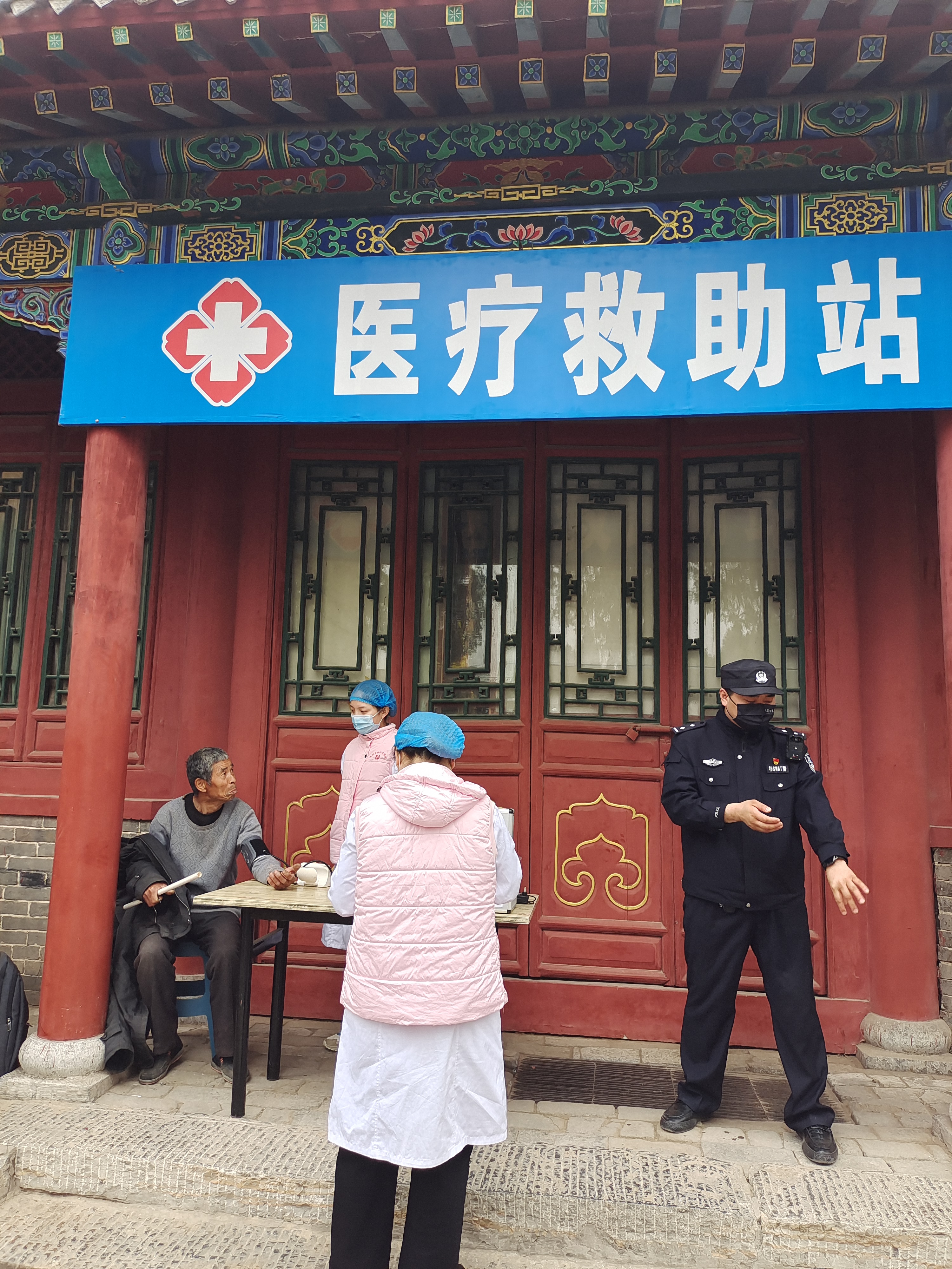 量血壓的姑娘叫蘇圓圓,據她介紹,全淮陽20多家醫院都派人在太昊陵各處設置“醫療救助站”,游客有任何不舒服可就近詢問觀察,各站都配有應急藥箱,如有需要免費使用。“這段時間人流量大,大家一定要遵守各項安全措施,避免意外發生。”蘇圓圓說。