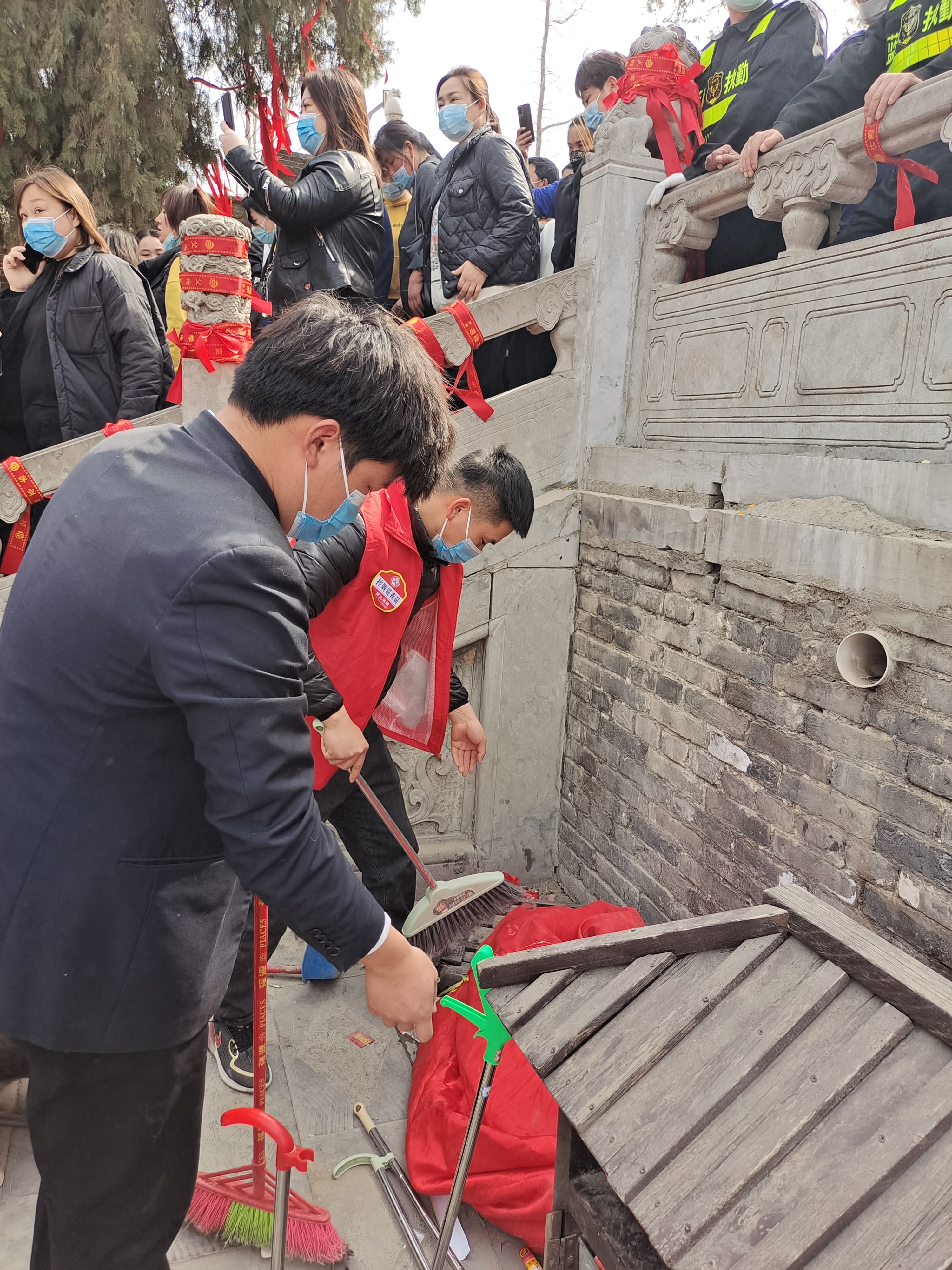 在伏羲陵墓后的蓍草園周圍,有人買紅布條系在欄桿上祈福,有人虔心祝禱。當蓍草成為聚焦點時,有人卻拿著打掃工具默默清理垃圾,讓蓍草園成為一方“凈土”。見他們身穿紅馬甲,記者上前詢問,原來是來自建業物業的志愿者,其中一名叫李小宇,他說太昊陵已經成為淮陽門面,要做好衛生,把太昊陵的良好形象維持住。“我們都是自愿前來,讓家鄉父老不論啥時候都看到一個干干凈凈的太昊陵!”李小宇說。