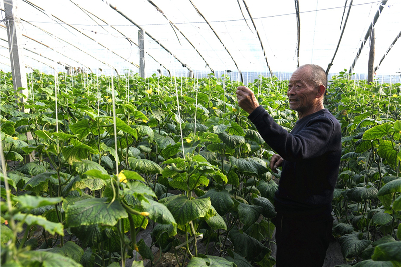 扶溝縣柴崗鄉梅橋村是遠近聞名的黃瓜種植專業村,全村1200畝土地上建有1100畝蔬菜大棚,最多的一戶村民有大棚10多個,畝均效益5萬多元,黃瓜種植成為當地鄉村振興的好產業。圖為昨日70多歲的脫貧戶梅鐵棍在幫助兒子管理黃瓜。