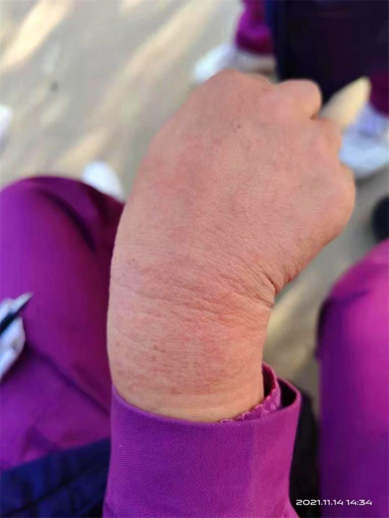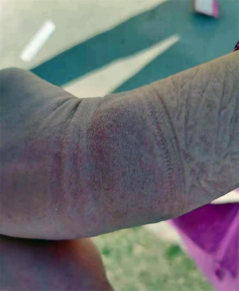 手部出現(xiàn)嚴(yán)重過敏反應(yīng),局部出現(xiàn)紅腫、皮疹癥狀