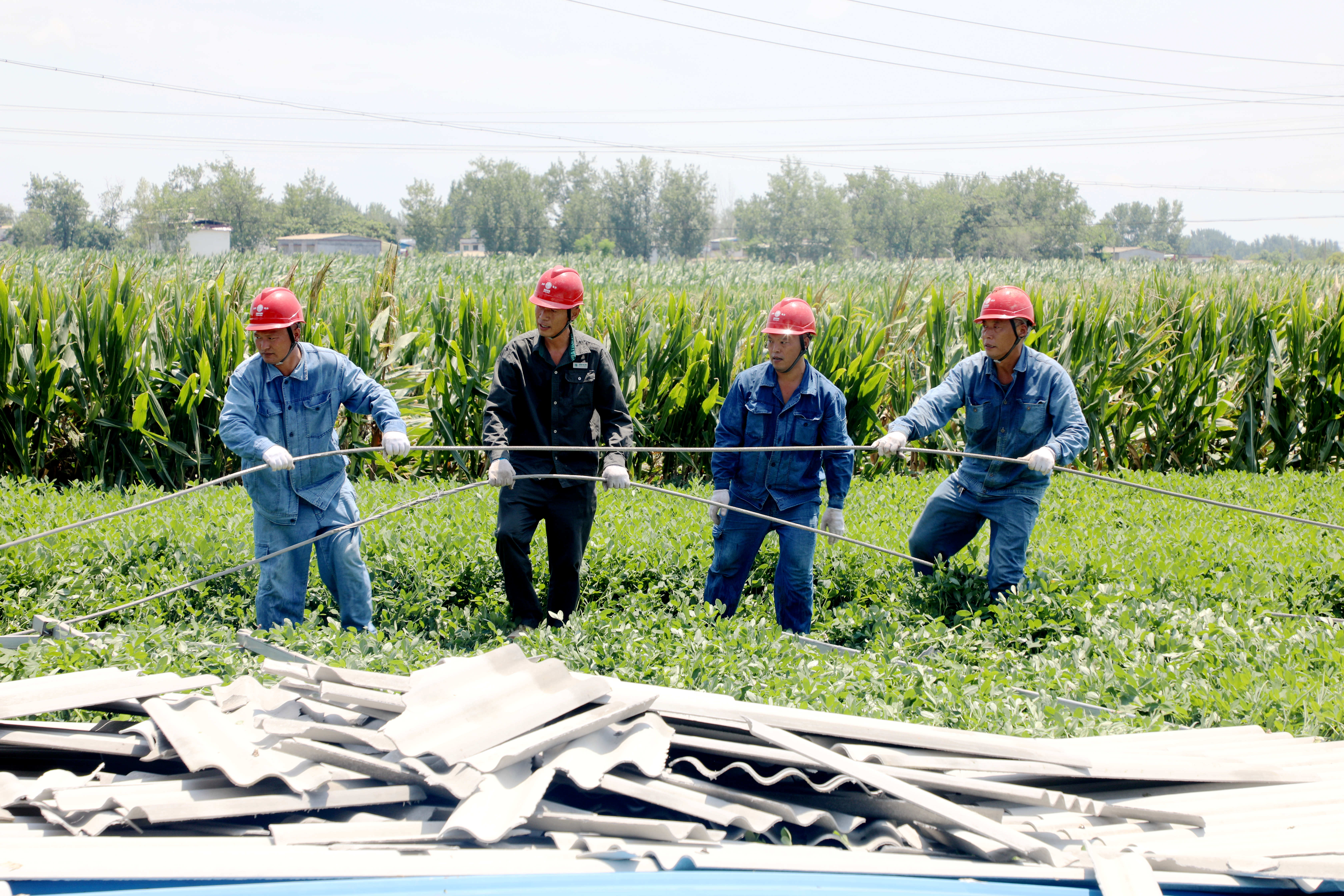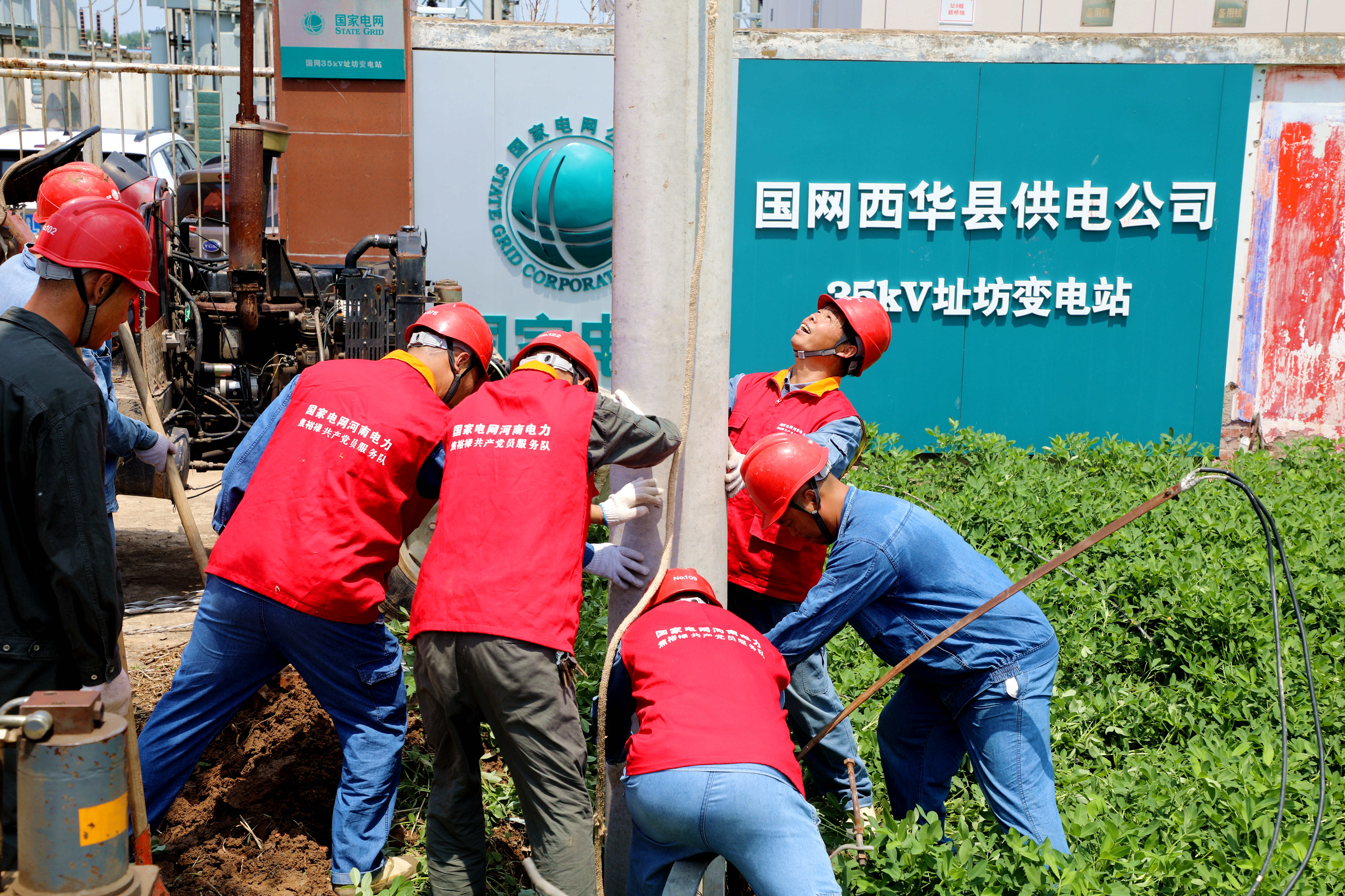 在35千伏址坊變電站10千伏灣張線出線倒桿緊急搶修現場,焦裕祿共產黨員服務隊沖在最前線,戰高溫、斗酷暑,將原電桿位置遷移,在安全地點重新立桿接線,高效完成牽引、挖坑、立桿、填土、鞏固、緊線等搶修工序。經過連續奮戰,7月26日20時06分因災停電線路全面恢復供電。③9