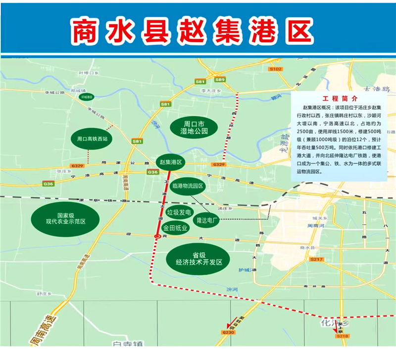 2017年,商水縣政府按照前瞻30年、謀劃15年、做實近5年工作要求,開始規劃修建位于湯莊鄉趙集行政村以西,張莊鎮韓莊村以東,沙潁河大堤以南,寧洛高速以北的趙集作業區。規劃建設占地約720畝、總投資6.37億元的趙集港項目,同時修建12個1000噸級泊位,其中散貨泊位8個,通用泊位2個,多用途泊位2個,占用岸線1250米,預計年吞吐量達475萬噸。碼頭采用順岸式布置,結構采用重力式扶壁結構,前沿配置30噸門座式固定吊裝卸作業。港口涵蓋貨物拆解區、散件堆放區等4個功能區,集裝箱露天堆場、大型貨車停車場等5個場地。圍繞趙集港,高標準規劃建設占地約6.2平方公里的多式聯運臨港經濟園區,下設金田紙業、建材倉儲兩個物流園區,涵蓋建材及建材制品園區、造紙業原料及成品園區、紡織服裝原料及成品園區3個功能園區。該項目建成投入使用后,不但能加快商水縣紡織園區、循環園區、經濟開發區、隆達電廠等企業物質的流轉,而且能使商水港成為周口沙潁河重要的鐵運、陸運、水運交通樞紐、貨物貿易和物流中轉聚集區,從而進一步促進商水經濟的健康、快速發展。