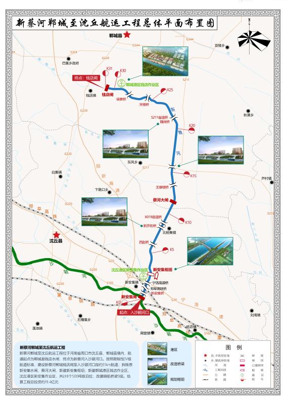 記者了解到,規劃中的鄲城港區是以新蔡河為依托,通過分析論證,確定其位置在新蔡河航運工程航道起點鄲城縣錢店鎮,航道終點為沈丘縣新安集沙潁河口,航道里程31公里。航道通航標準為限制性Ⅳ級,設計船舶為500噸級。航道底寬40米,最小設計水深3.1米,最小彎曲半徑320米。船閘按照Ⅳ級船閘標準建設。沿線建設沈丘港區新安集、鄲城港區錢店兩個作業區,設計500噸級泊位8個,改建礙航橋梁標準9座。初步估算,工程總投資19.4億元。