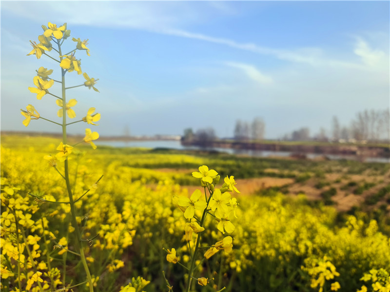 • 4月2日,春日明媚,沙潁河兩岸一片片金燦燦的油菜花“染黃”了大地,空氣中彌漫著香氣,大片的油菜花和漂亮的村居、田間勞作的農民交織在一起,如詩如畫,美不勝收,讓人心曠神怡。