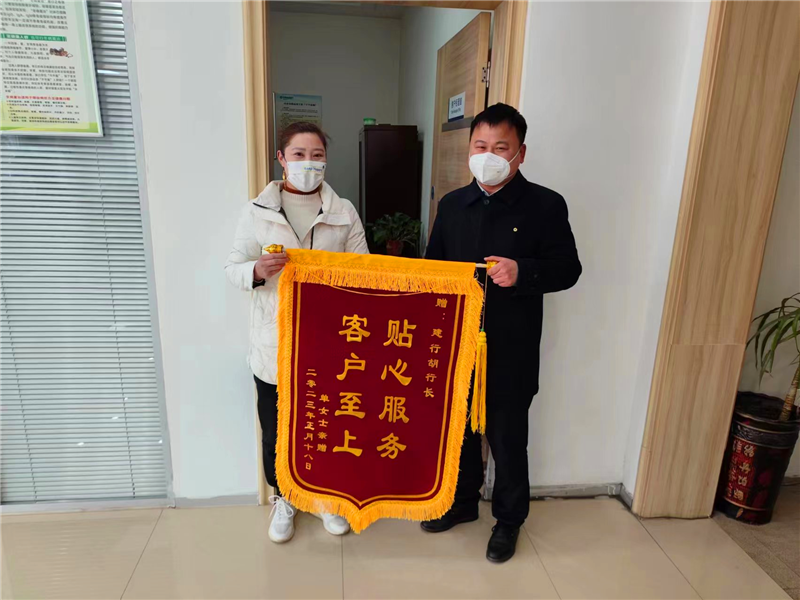 “項城蓮花大道支行的工作人員服務熱情,辦事靠譜,處處為我們著想,錢存在這里,我十分放心!”2月12日,項城市單女士為建行周口分行項城蓮花大道支行送來一面寫有“客戶至上 貼心服務”的錦旗, 對蓮花大道支行全體工作人員的熱情高效、認真負責的工作態度表示認可和感謝。單女士十分感激地把錦旗遞給了項城蓮花大道支行負責人胡洋洋,并為其點贊。