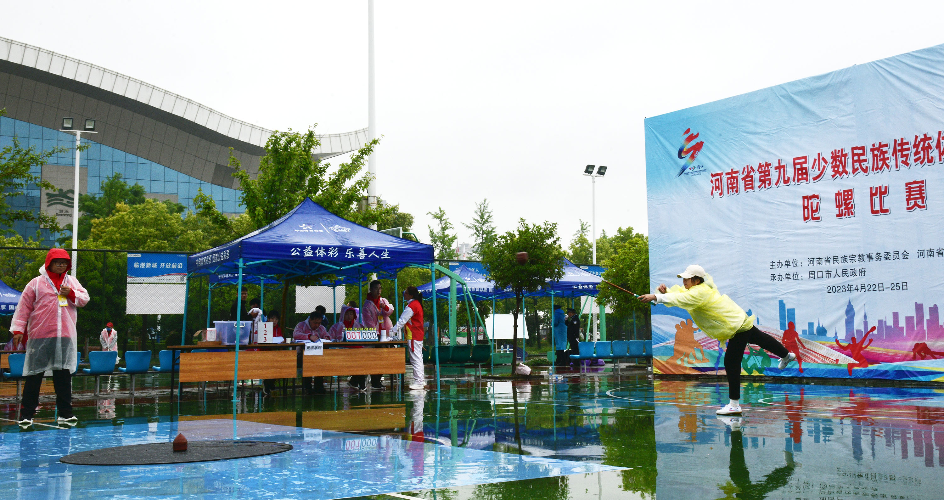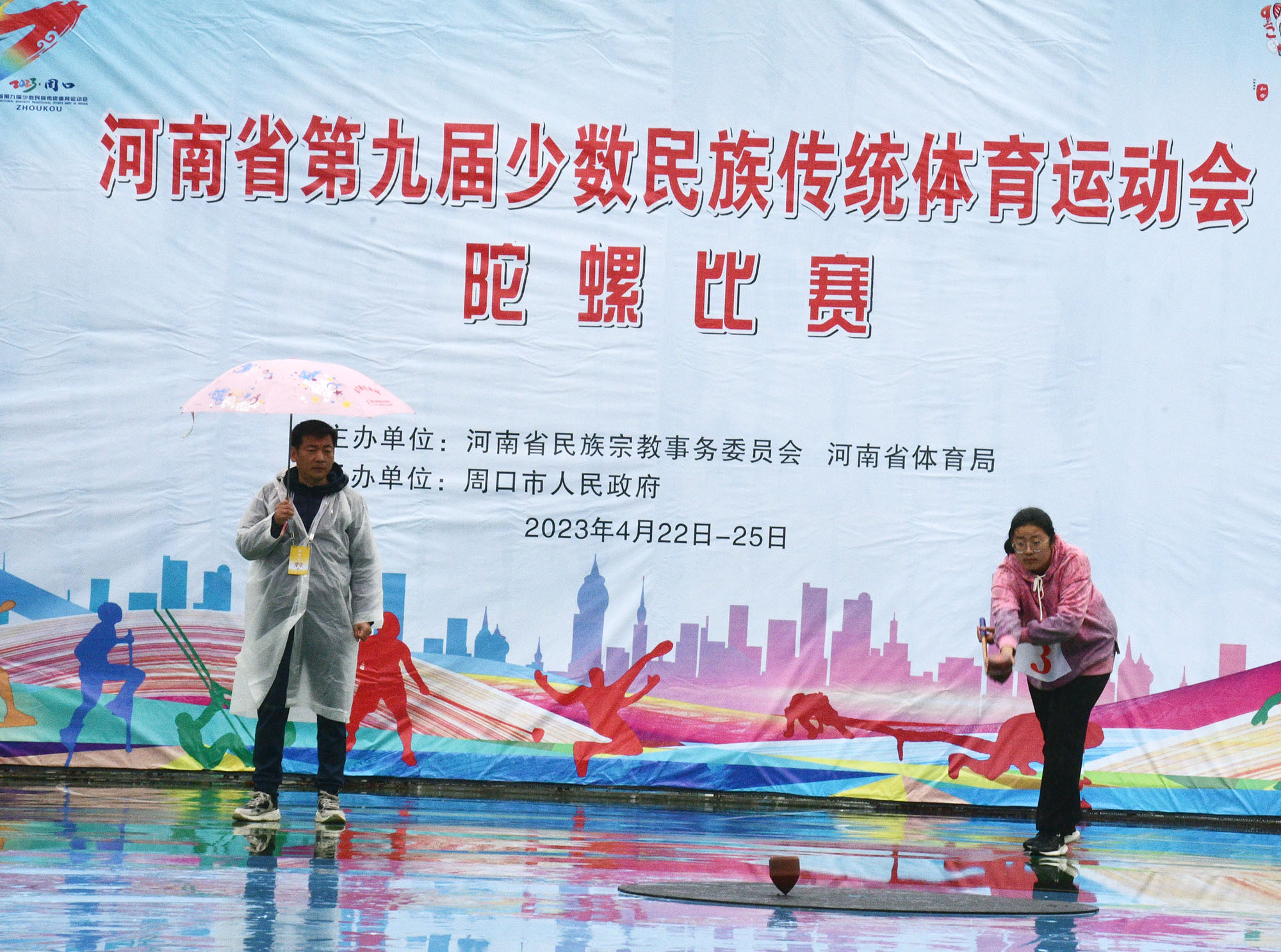 4月23日上午,河南省第九屆少數民族傳統體育運動會開賽。圖為在市體育中心進行的板鞋競速和陀螺比賽。記者 梁照曾 攝