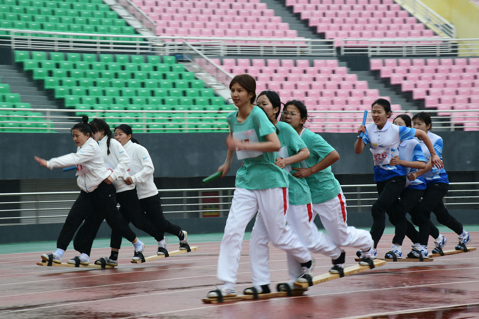 三人共穿一雙板鞋,板鞋競速項目考驗著運動員的默契度,需要達到“三人合一、人板合一”的程度。在雨天,板鞋與賽道、腳底與板鞋之間都容易打滑,一定程度上制約著運動員的發(fā)揮。