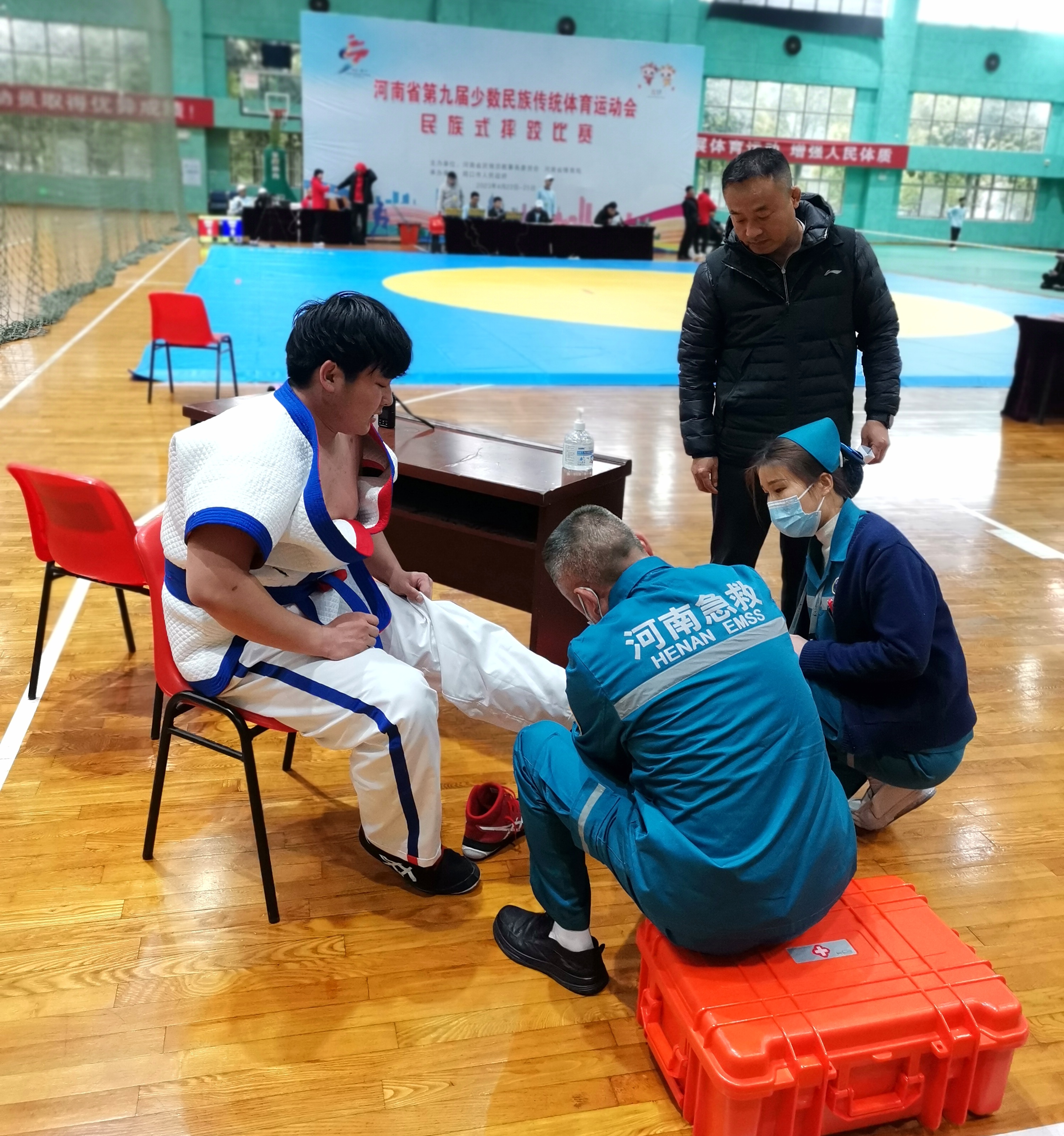 4月22日至26日,河南省第九屆少數民族傳統(tǒng)體育運動會在周口市舉辦。為確保來賓、運動員、教練員、技術官員等參會人員的醫(yī)療衛(wèi)生安全,周口市衛(wèi)生健康部門全面調動全市醫(yī)療資源,建立覆蓋各競賽項目及指定接待賓館的醫(yī)療救治、衛(wèi)生監(jiān)督、防疫消殺等醫(yī)療保健服務體系,認真完善各項工作方案、預案,制定細化工作流程,為省運動會提供及時有效、熱情周到的醫(yī)療衛(wèi)生保障服務。圖為運動員在比賽中受傷,現場保障的醫(yī)護人員迅速處置。