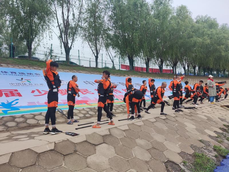 當日上午,氣溫微涼。在沙潁河水上運動中心,醫護人員、救援人員、志愿者等工作人員早早到崗,為賽事的順利進行做好了充足的準備。運動員們身穿救生衣,正在岸邊熱身,等待入場比賽。
