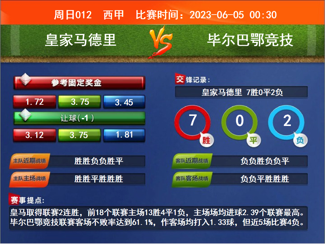 比賽時間:2023-06-05 00:30賽事提點:皇馬取得聯賽2連勝,前18個聯賽主場13勝4平1負,主場場均進球2.39個聯賽最高。畢爾巴鄂競技聯賽客場不敗率達到61.1%,作客場均打入1.33球,但近5場比賽4負。
