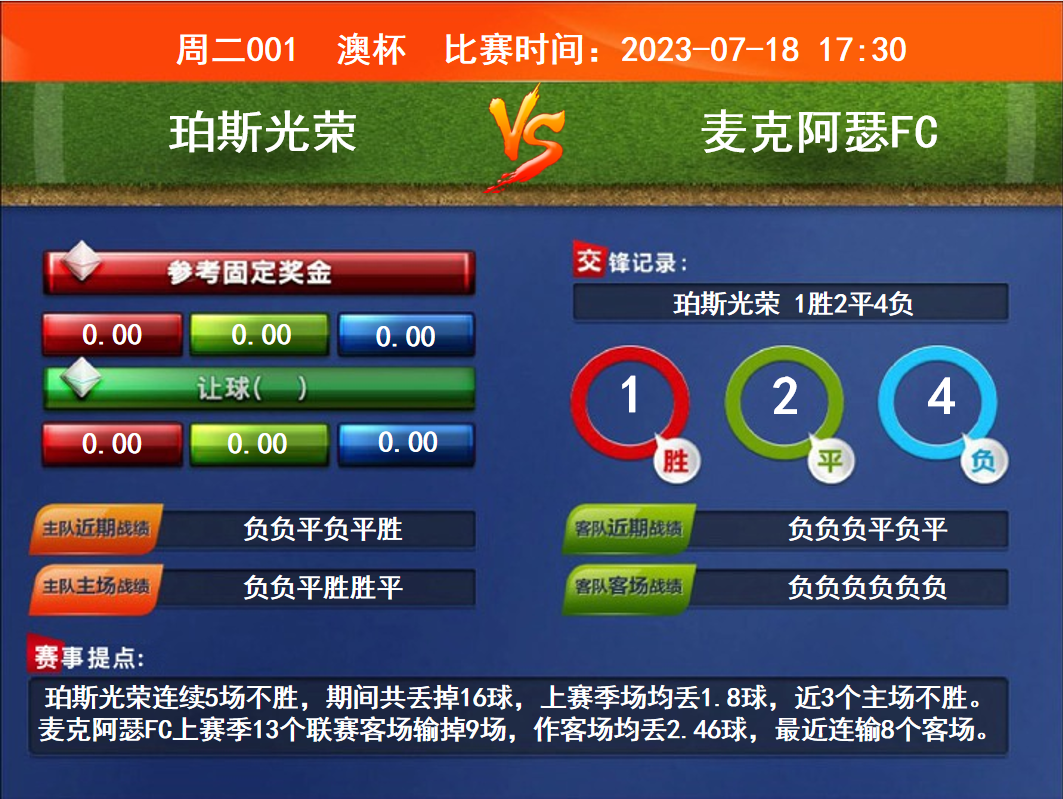 比賽時間:2023-07-18 17:30賽事提點:珀斯光榮連續5場不勝,期間共丟掉16球,上賽季場均丟1.8球,近3個主場不勝。麥克阿瑟FC上賽季13個聯賽客場輸掉9場,作客場均丟2.46球,最近連輸8個客場。
