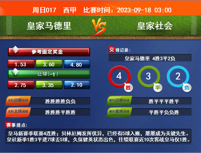 比賽時間:2023-09-18 03:00賽事提點:皇馬新賽季聯賽4連勝;貝林厄姆發揮優異,已經有5球入賬,屢屢成為關鍵先生。皇社新季1勝3平進7球丟5球,久保健英狀態出色,往績聯賽近10次客戰皇馬僅1勝。