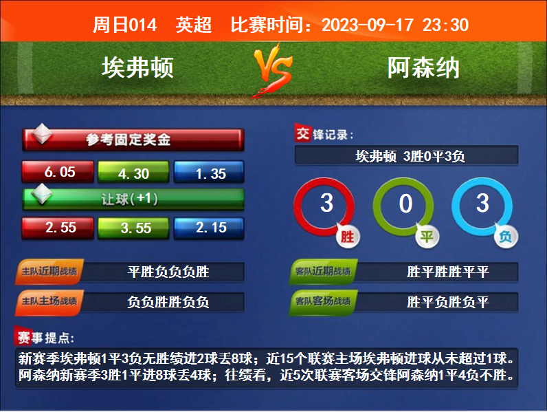 比賽時間:2023-09-17 23:30賽事提點:新賽季埃弗頓1平3負無勝績進2球丟8球;近15個聯賽主場埃弗頓進球從未超過1球。阿森納新賽季3勝1平進8球丟4球;往績看,近5次聯賽客場交鋒阿森納1平4負不勝。