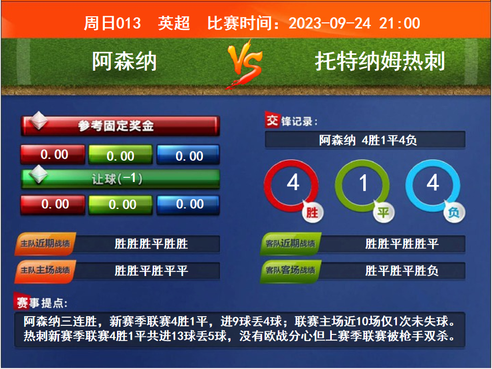 比賽時間:2023-09-24 21:00賽事提點:阿森納三連勝,新賽季聯賽4勝1平,進9球丟4球;聯賽主場近10場僅1次未失球。熱刺新賽季聯賽4勝1平共進13球丟5球,沒有歐戰分心但上賽季聯賽被槍手雙殺。