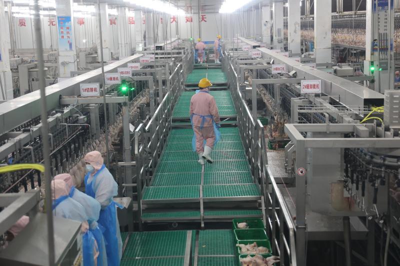 西華雙匯宰雞廠位于西華縣中都路與華安路交叉口東北角,2020年8月份開始施工建設,2022年1月份建成投產。宰雞項目設計年屠宰肉雞1億只,雙班雙線生產,車速2.5萬只/小時,日宰35萬只,規劃產品有冰鮮白條雞、雞胸肉、雞腿肉、琵琶腿、雞翅中、雞翅根、雞爪等152個品種規格,日產出雞產品875噸,其中鮮品555噸,凍品220噸,地銷、化制和煉油產品100噸,年產出雞產品25萬噸。屠宰的各個環節做到全程監控,建立起“三級生物安全防控措施”,形成從檢測到屠宰等嚴格過程的控制體系,使屠宰各環節不受到污染,實現高度清潔的全產業鏈健康屠宰。產品從分割、包裝、入庫到配送、市場銷售整個過程嚴格在0-4℃環境中進行,保證雞肉新鮮。