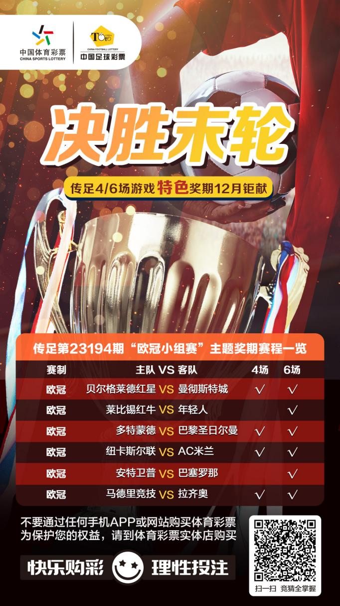 第23194期傳足特色獎期已經于12月10日20:00開售,將于12月13日22:00停售,并于12月14日開獎。其中貝爾格萊德紅星VS曼徹斯特城、多特蒙德VS巴黎圣日爾曼、紐卡斯爾聯VSAC米蘭和馬德里競技VS拉齊奧為4場進球游戲競猜賽事。