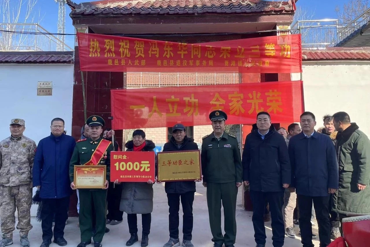 喜報傳佳音,榮耀滿門庭。為進一步弘揚新時代擁軍優屬光榮傳統,增強軍人榮譽感和軍屬自豪感,1月22日,鹿邑縣人武部領導帶領縣人武部、縣退役軍人事務局及賈灘鎮黨委政府相關負責同志及現役軍人所在部隊代表一行人,敲鑼打鼓來到榮立三等功的現役軍人馮東華同志家中,送上立功喜報和慰問品,向立功軍人及家屬表達親切的關懷和衷心的祝賀。