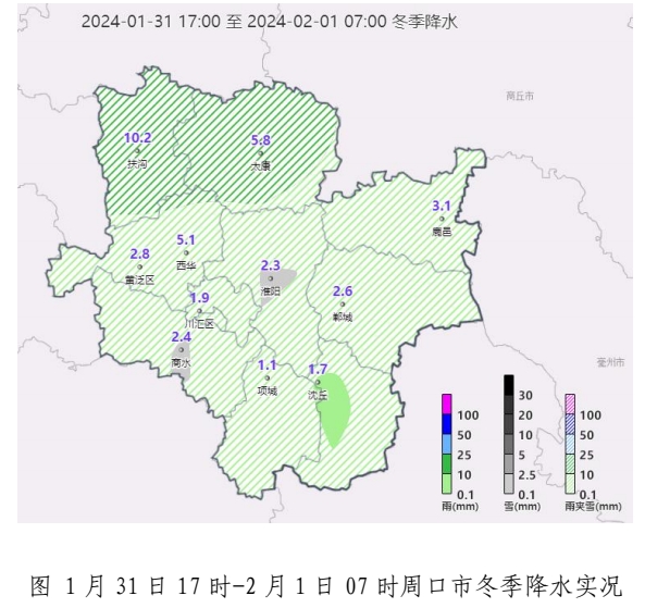 1月31日17時—2月1日7 時,我市出現(xiàn)小雨轉(zhuǎn)雨夾雪、北部地區(qū)中到大雪天氣。截止到1日7時。國家站累計雨雪量(毫米)為:扶溝10.2、太康5.8、西華5.1、鹿邑3.1、黃泛區(qū)2.8、鄲城 2.6、商水 2.4、淮陽 2.3、川匯區(qū) 1.9、沈丘1.7、項(xiàng)城1.1。各地區(qū)7時雪深(厘米):太康5、扶溝4、西華4、黃泛區(qū)1、鹿邑1。