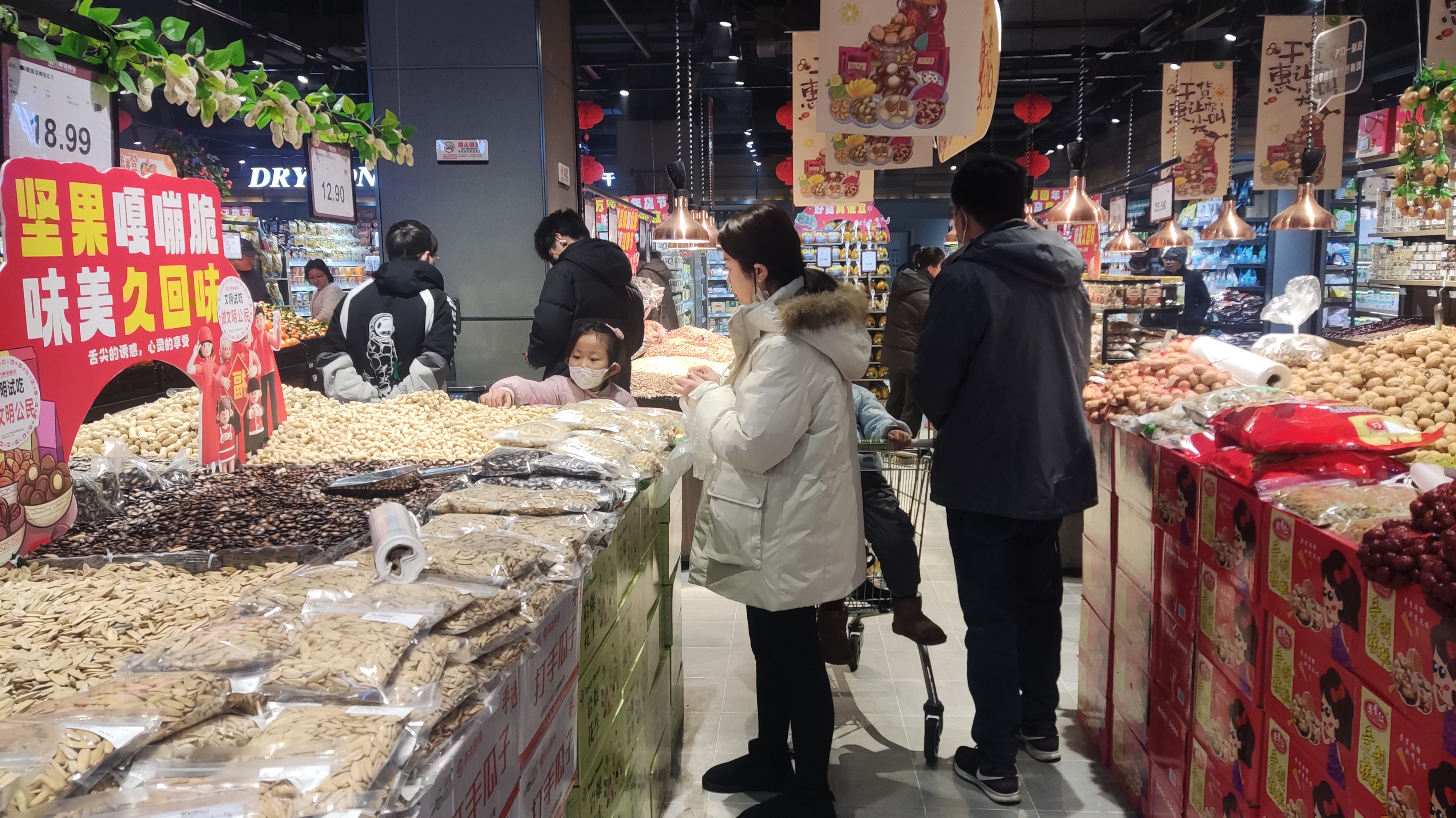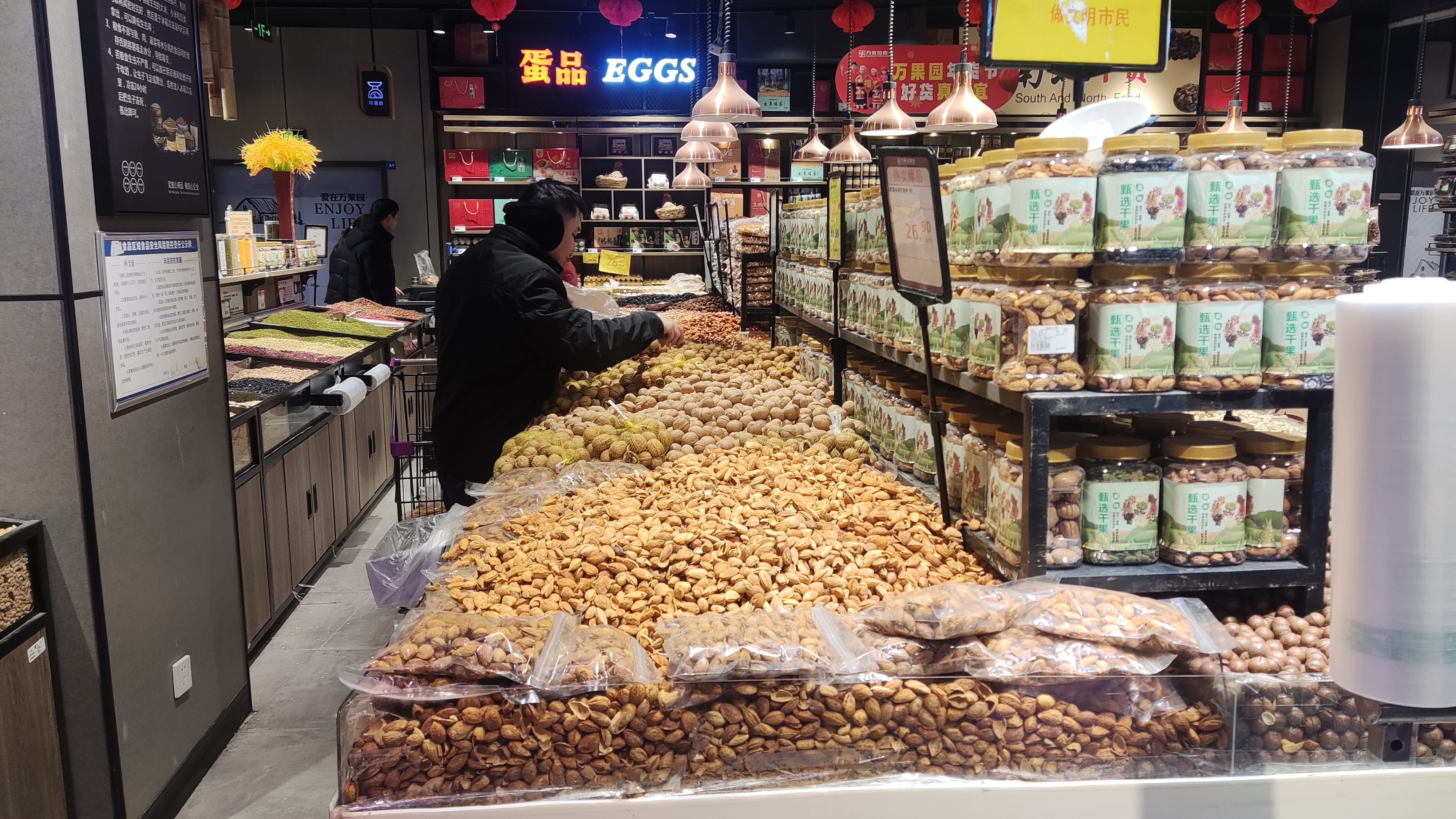 核桃、巴旦木、夏威夷果、碧根果……市民陳女士拎著一大包商品滿(mǎn)載而歸?!俺詧?jiān)果健康又養(yǎng)生,家里人都喜歡吃,過(guò)年期間一家人邊聊天邊吃堅(jiān)果,滿(mǎn)滿(mǎn)年味?!标惻空f(shuō),組合裝小袋堅(jiān)果比較劃算,里面有剝好的杏仁、核桃、腰果等,價(jià)格不貴,方便實(shí)惠。