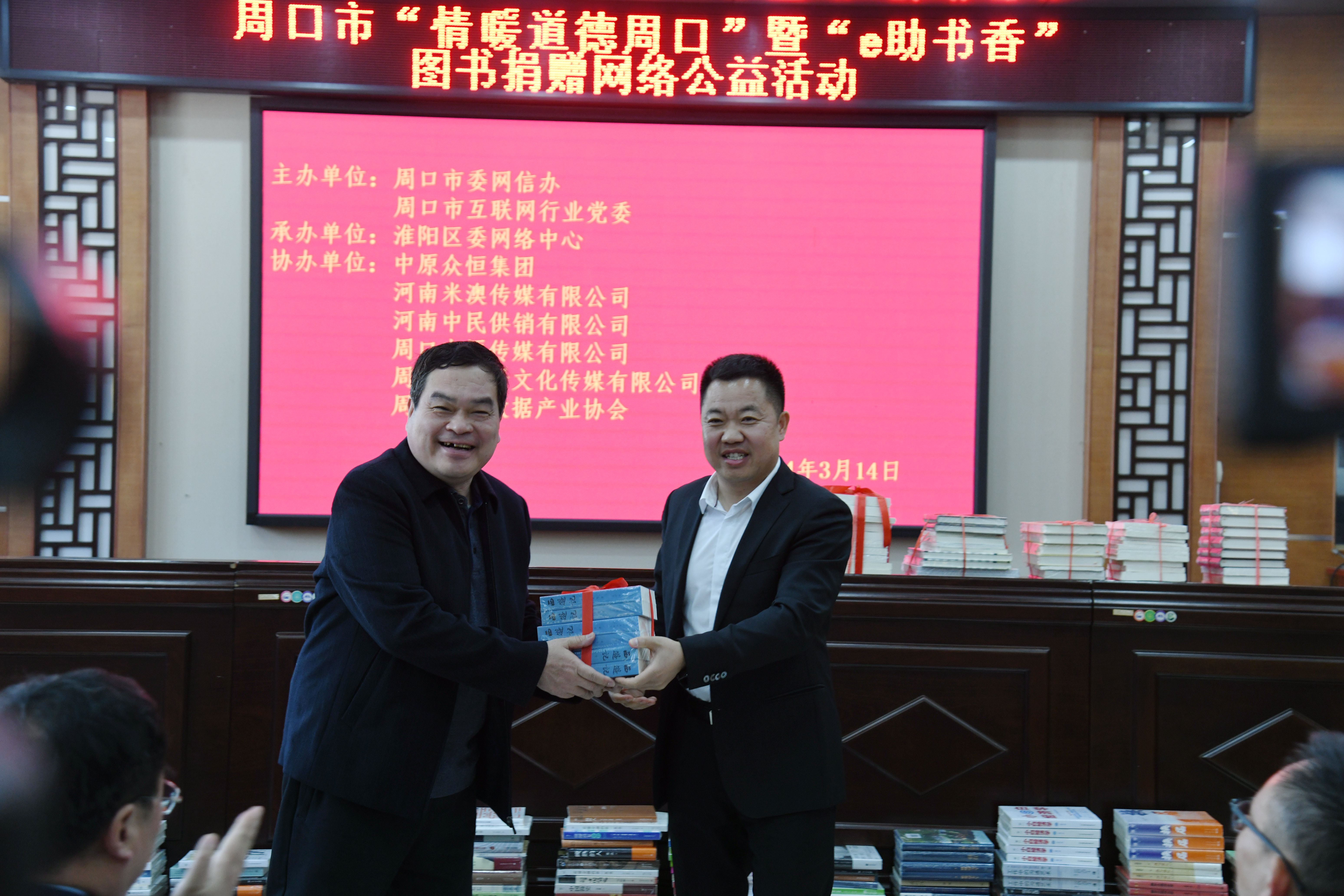 3月14日,由周口市委網信辦、周口市互聯網行業黨委主辦的“情暖道德周口”暨“e助書香”圖書捐贈網絡公益活動在淮陽區舉行。我市6家愛心企業聯合捐贈一批圖書,為正在火熱進行的伏羲書展助上一臂之力。