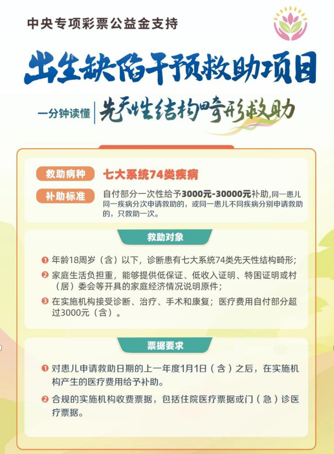 中央專項彩票公益金支持出生缺陷救助項目,旨在向患有遺傳代謝病、先天性結構畸形和功能性出生缺陷等三類出生缺陷疾病的經濟困難家庭提供醫療費用補助,減輕患兒家庭醫療負擔。該項目由衛生健康委委托中國出生缺陷干預救助基金會組織實施。