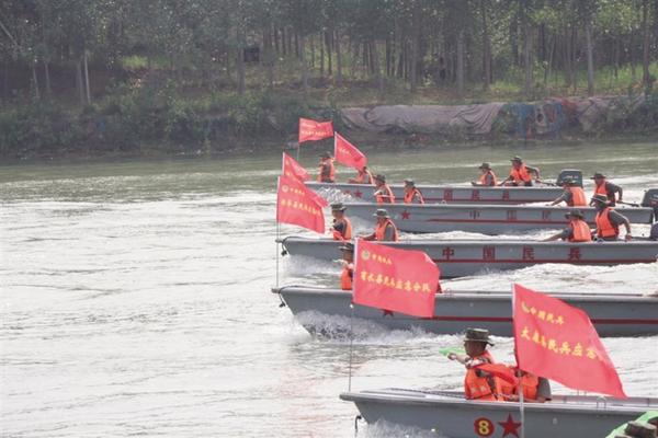 民兵操縱沖鋒舟進行水上編隊演練。