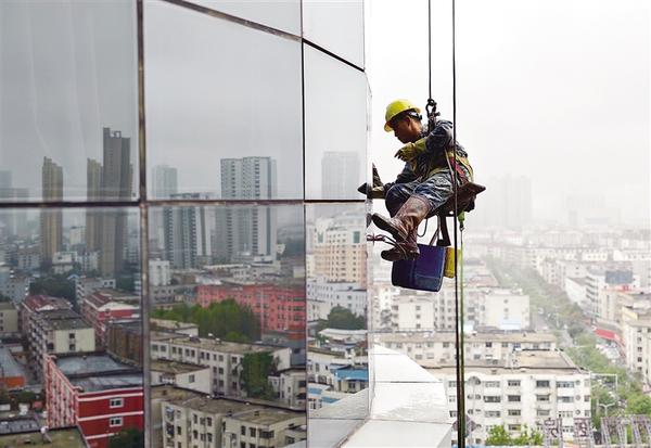 近日,一名“蜘蛛人”在中心城區一座大樓的外墻面認真作業,為城市的美麗和整潔貢獻著自己的力量。 段繼軍 攝