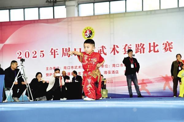 11月1日上午,小朋友展示長拳。當日,由周口市武術協會主辦、周口市體育中心協辦的“2025年周口市武術套路比賽”在周口市體育中心開賽,來自全市不同武術門派和拳種的43支代表隊的千名武術愛好者參與套路、器械等比賽,他們的扎實功底和不同風格的拳術展示贏得陣陣喝彩,展示了我市武術發展的成果。記者 梁照曾 攝