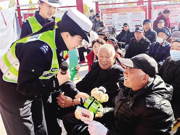11月28日,民警將“交警小熊”送給一位村民。當日,商水縣公安局交通警察大隊組織民警、輔警,攜手縣豫劇中心走進湯莊鄉西趙橋村,開展“美麗鄉村行”交通安全宣傳活動,通過營造宣傳氛圍,讓群眾自覺遵守法律法規,安全文明出行。