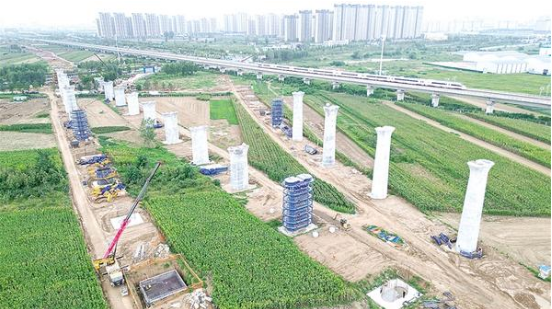 9月21日上午,在平漯周高鐵接入高鐵周口東站的施工現場,中鐵十局的工人正緊張施工。據了解,該項目將通過新建三條軌道接入高鐵周口東站,屆時,高鐵周口東站將升級成為四條軌道并行的高鐵樞紐站。