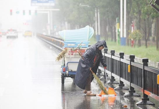 9月22日清晨,連綿的秋雨持續不斷,在周口市淮陽區弦歌西路,一位環衛工人冒雨清理道路上的垃圾,保障市民安全順暢通行。