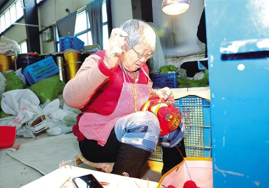 冬日清晨,鄲城縣汲冢鎮(zhèn)謝寨行政村吉特體育用品車間里,陽光穿過廠房玻璃窗,落在72歲周桂英老人布滿老繭的手上。周桂英正專注進(jìn)行著足球縫制的最后一道工序——封口,只見她雙手各執(zhí)一針,左手進(jìn)、右手出,紅色棉線在紅白相間的足球表面快速穿梭。飛針走線間,一場指尖上的“魔術(shù)”正在上演。