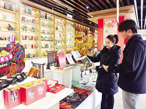 12月18日,在太昊伏羲陵文化旅游區旅游產品展廳,游客在欣賞非遺手工產品。近年來,太昊伏羲始祖旅游區運營管理有限公司為豐富游客體驗,聚焦非遺手工、潮玩手辦等主題,開發了近百個旅游新產品,以滿足游客多元化需求。