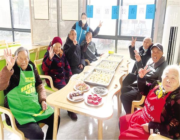 12月20日,在淮陽區第一養老服務中心,生活在這里的老人們和社工包完餃子后露出開心的笑容。