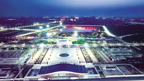 華燈初上,西華高鐵站夜景如畫。站前廣場布局規整,彩色鋪裝、圓形圖案兼具美觀與實用性,優化人流集散。