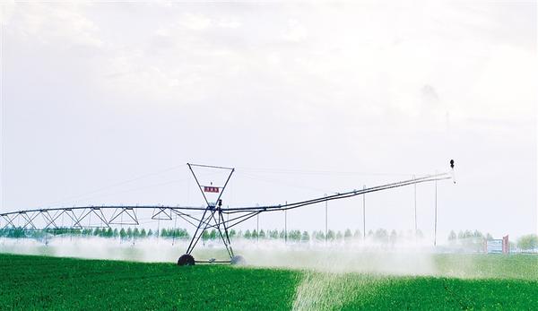 近日,在河南周口國家農高區(qū)鄲城縣高標準農田示范區(qū),平移式噴灌機伸展銀色“臂膀”,將精準調配的水肥溶液均勻灑向綠油油的麥田。