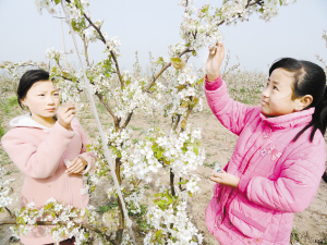 4月12日,商水縣舒莊鄉北王張村的小學生在自家的梨園為梨花授粉。星期天,該村的小學生紛紛跑到梨園欣賞盛開的梨花,幫助家長為梨花授粉,享受著在梨花中勞動的樂趣。