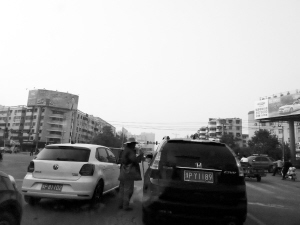 圖① 市區多個路口都存在攔車行乞現象,既不文明又不安全。