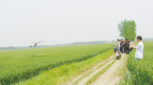 5月7日,一架小型直升機為小麥噴灑農藥。當前,正是小麥 “一噴三防”的關鍵時期,項城市三店鎮多方聯系,引進小型直升機為小麥高產示范田噴灑農藥,為豐產豐收奠定良好基礎。董方靈 攝