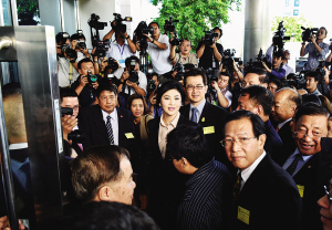 泰國最高法院首次開庭審理英拉“大米案” 5月19日,在泰國曼谷,泰國前總理英拉(中)到達泰國最高法院出席大米收購案聽證會。新華社發