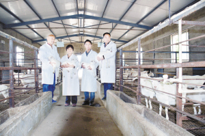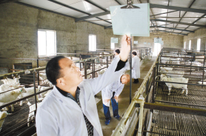 孫振偉原是當地著名的青年企業家,2008年初被西關村居民高票選舉為村黨支部書記,憑著對家鄉的強烈責任感和保護槐山羊特色品種的使命感,孫振偉帶領西關村立足本村作為槐山羊傳統養殖區的優勢,于2010年成立沈丘縣槐山羊養殖發展有限公司,在省畜牧展交易會上,與鄭州鄭源公司合作,共同簽約了投資6000萬元建設槐山羊原種保護、繁育、深加工項目。同時與華中農大建立技術合作關系,投資800萬元建成“槐山羊原種保護和繁育中心”,規劃設計了化驗室、消毒室、提純復壯室、品種基因室等配套規范設施,不僅為國家級優良品種槐山羊的保種提純工作提供了科研平臺和寶貴數據庫,“槐山羊提純復壯良種繁育技術研究與應用”成果還獲得2013年度周口市科技進步一等獎。經過提純復壯,目前中心存欄特征明顯的槐山羊母羊860只、種公羊36只,在此基礎上,計劃建成占地100畝的槐山羊養殖小區,槐山羊板皮、肉制品等深加工項目都已經開始實施。 “這些是經過第五輪提純復壯繁育的槐山羊,目前可以說是最純種的槐山羊了。”孫振偉指著一批剛出生的小羊向我們介紹。