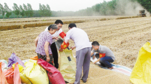 上圖:6月7日,商水縣鄧城鎮督查隊員在幫許村困難戶張翠蘭收麥子。三夏期間,該鎮成立16支三夏幫扶隊和督查隊,深入田間地頭幫助困難戶夏收夏種。(喬連軍 攝)